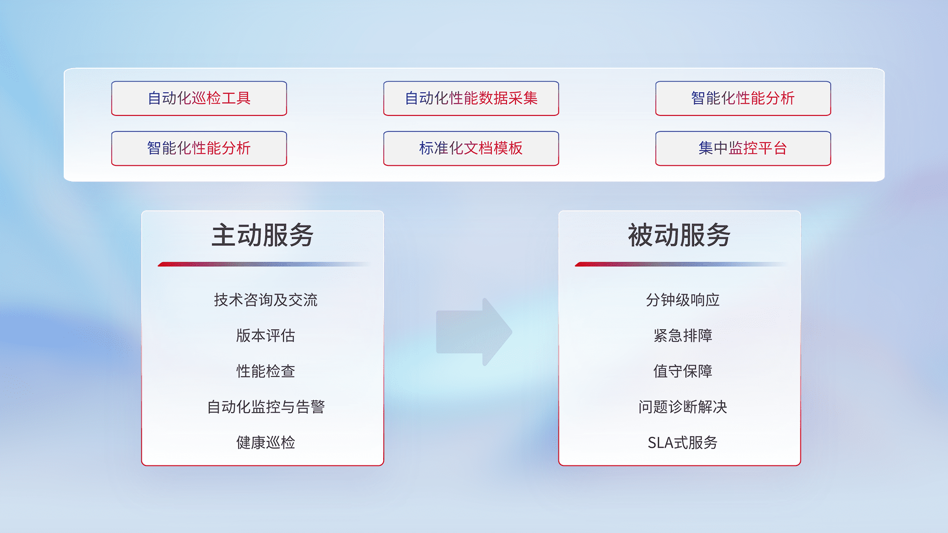 智能化工具和标准化文档,,,保障服务质量,,提供主动服务(包含技术咨询、、、版本评估、、性能检查、、自动化监控与告警、、健康巡检)和被动服务包含(分钟级响应、、紧急排障、、值守保障、、、、问题诊断解决、、SLA服务)。。